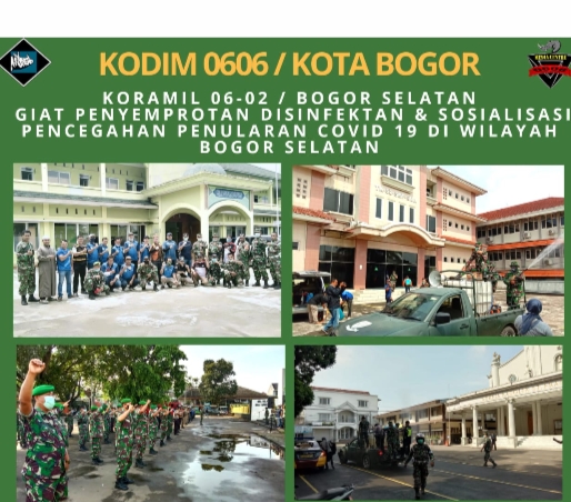 Penyemprotan Cairan disinfektan secara serentak di dua wilayah kecamatan setiap harinya terus dilakukan oleh tim gabungan TNI – Polri yang bersinergi dengan Dinas dinas terkait, kini giliran Wilayah kecamatan Bogor Selatan dan Bogor Timur yang hari ini mendapat guyuran Disinfektan,