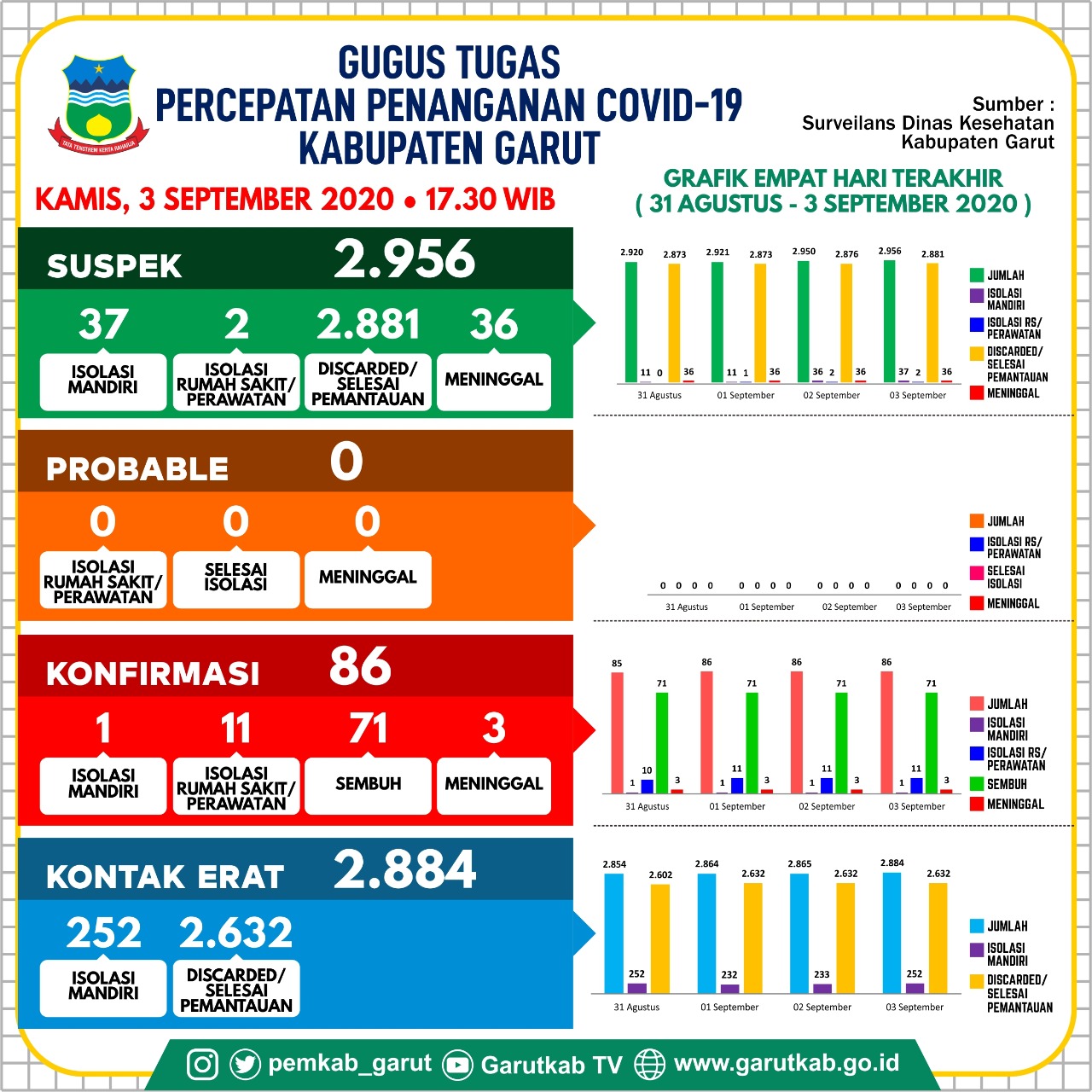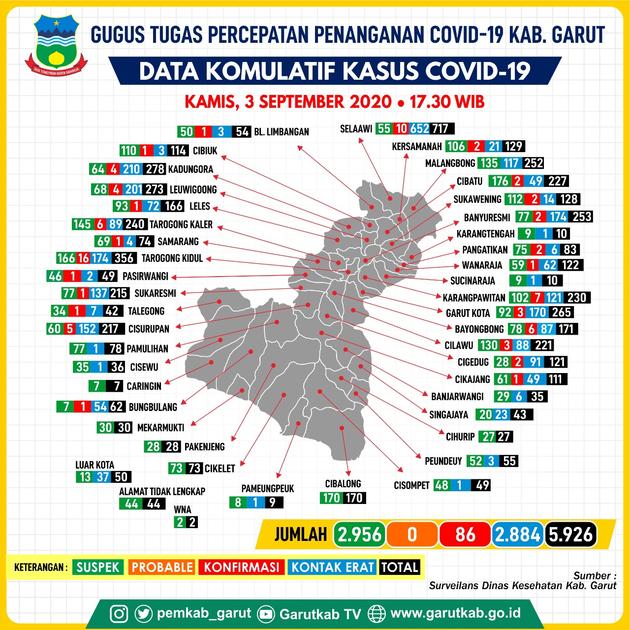Garut,–Sorotperadilan.com l Perkembangan Kasus Covid-19 di Kabupaten Garut s.d Hari ini Kamis, 03 September 2020 Pukul 17.30 WIB. Berdasarkan data dari Sub Devisi pencegahan Gugus Tugas Percepatan Penanganan Covid-1o Kabupaten Garut.