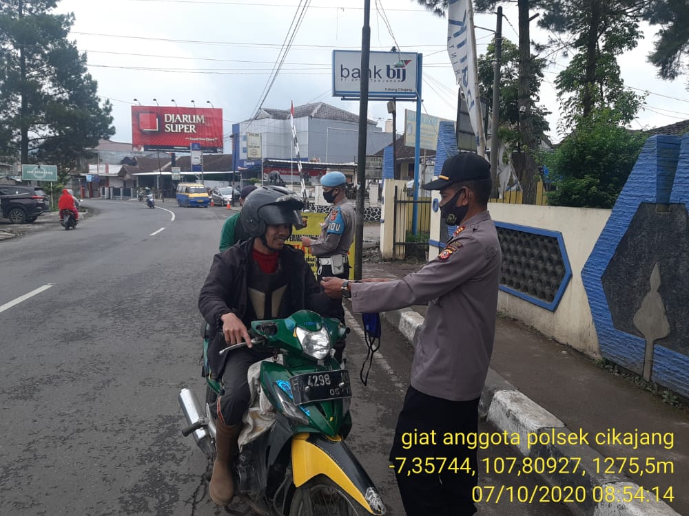 Melaksanakan kegiatan Ops Yustisi Penegakan Disiplin tingkat Kecamatan Cikajang bertempat di depan Kantor Kecamatan Cikajang.