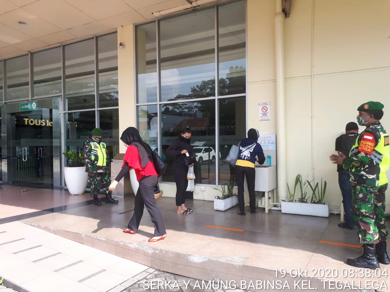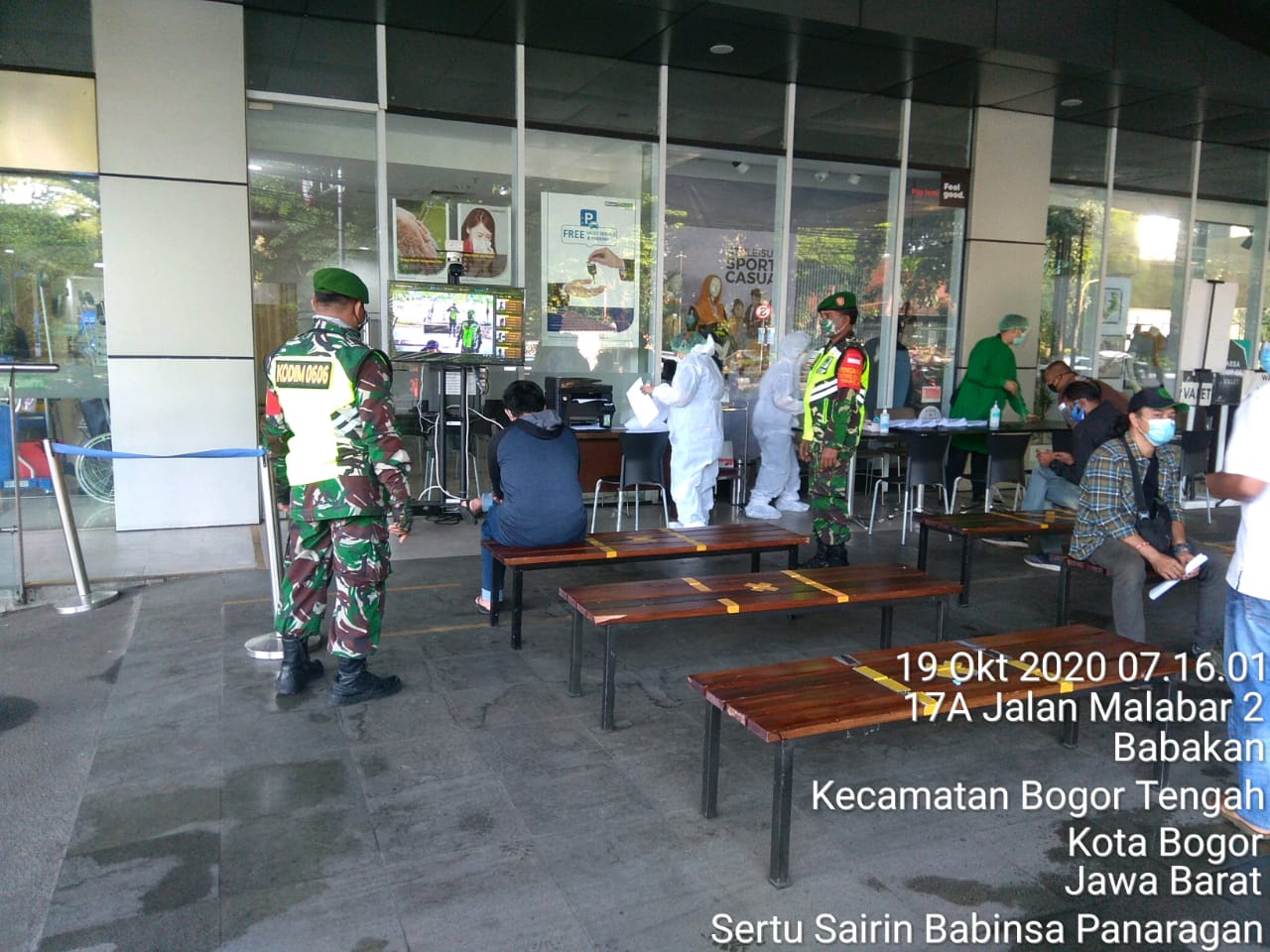 Bogor – Sorotperadilan.com | Jajaran Personil Koramil 0601/Bogor Tengah ( Kodim 0606/Kota Bogor ), Melaksanakan pengawasan protokol kesehatan covid – 19 dan ketentuan Pembatasan Sosial Berskala Mikro dan Komunitas ( PSBMK ) Tahap II Kota Bogor seluruh wilayah Objek Vital Bogor Tengah diantaranya Mall Botani, Mall BTM , Stasiun KRL, RS Siloam , Mall Dewi Sartika dan Pasar Anyar ,Senin ( 19/10/2020) Pagi.