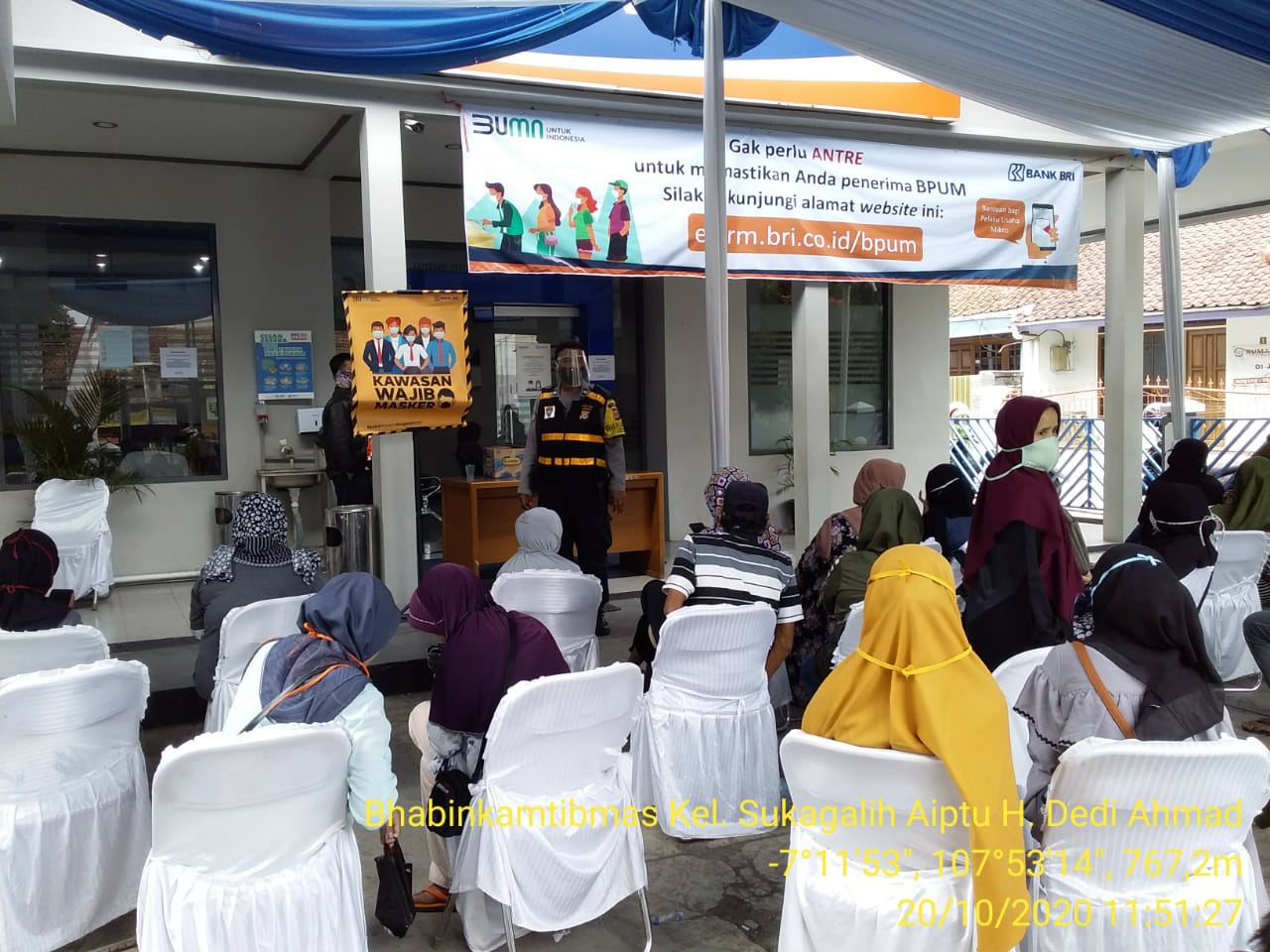 Garut,–sorotpetadilan.com I Bhabinkamtibmas Polsek Tarogong Kidul Polres Garut Polda Jabar sosialisasikan 3M kepada masyarakat pada pencairan BPUM diwilayah dikelurahan sukagalih untuk selalu menerapkan protokol kesehatan , Rabu ( 21/10/2020 )