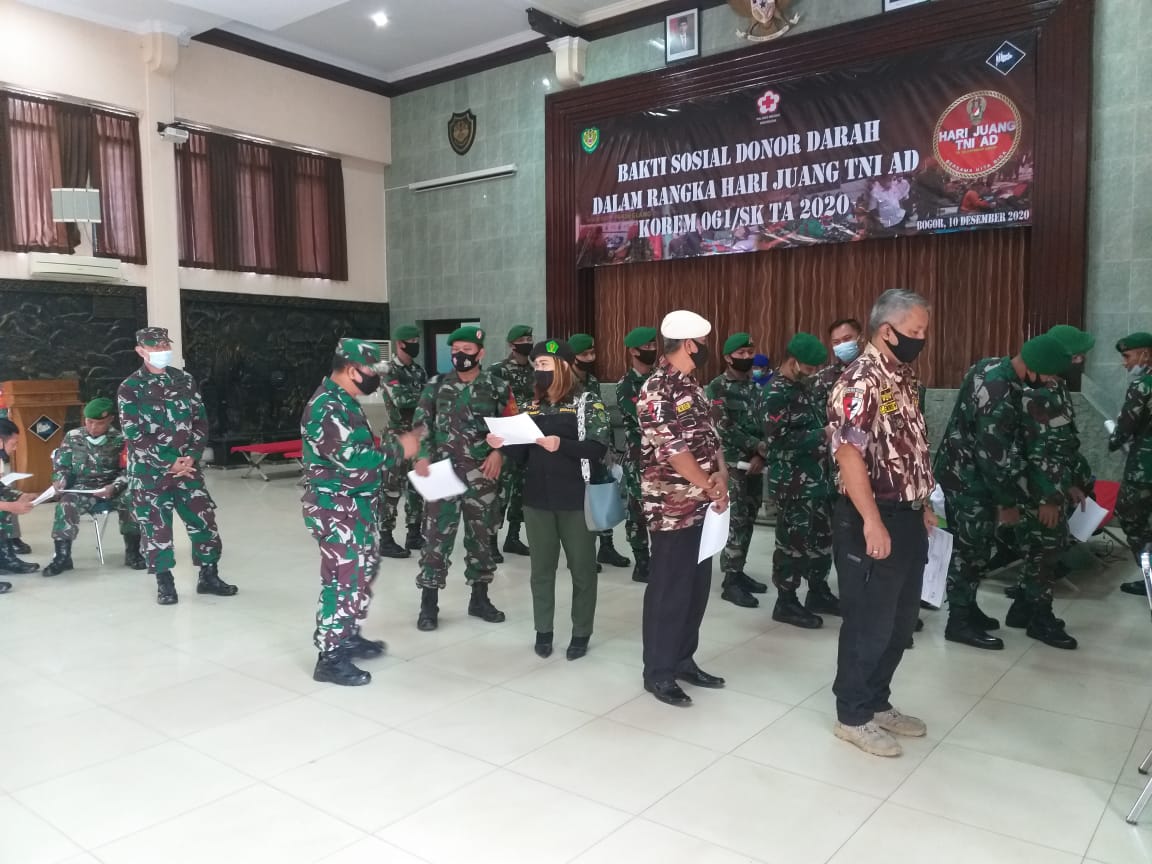 Bogor -Sorotperadilan.com | Dalam rangka Hari Juang TNI AD 2020, Korem 061/Suryakancana menyelenggarakan kegiatan Bakti Sosial (Baksos) Donor Darah, bertempat di Aula Suryakancana, Jl. Merdeka no.64 Kota Bogor, Kamis (10/12).