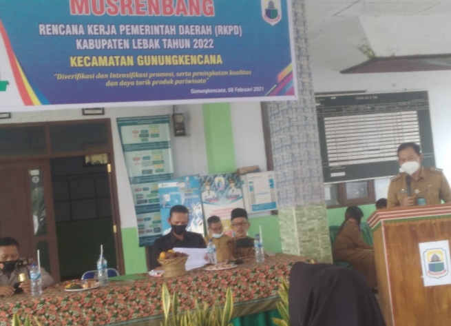 Camat gunung kencana ; Firman arif hidayat.s.Stp.,M.Si.dalam membuka acara sekaligus memberikan sambutan menyampaikan. “saya ucapkan terimakasih kepada seluruh tamu undangan yang telah hadir, semoga dalam Musrenbang ini. dapat menghasilkan kesepakatan bersama agar kecamatan gunungkencana dapat lebih maju serta dalam musyawarah usulan ditiap desa mampu di sepakati oleh pihaknya dan dalam acara ini kami pemerintah kecamatan gunung kencana tetap menjalankan dan menerapkan protokol kesehatan.seperti melakukan pembatasan peserta undangan Musrenbang agar tidak menimbulkan kerumun yang berlebihan di masa pandemi saat ini.