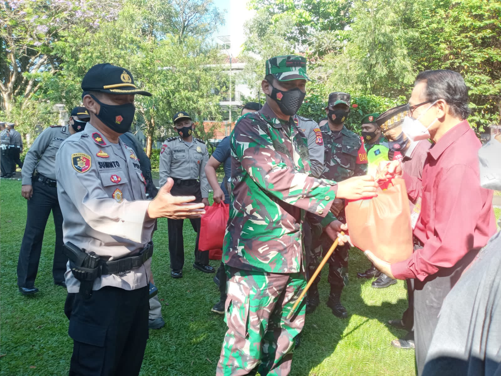 Masih di tempat Apel Dandim 0606/Kota Bogor membagikan secara simbolis paket sembako kepada perwakilan satgas Rw Siaga covid-19 untuk di bagikan kepada warga yang sedang menjalani lsolasi mandiri, Selepas Apel Dandim 0606/Kota Bogor melanjutkan kegiatan pemantauan dan pengecekan Posko Rw Siaga Covid-19 di Rw 04 Kelurahan Babakan Kecamatan Bogor tengah. (Erris)