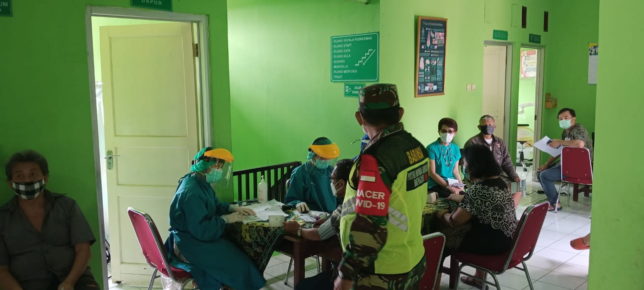 KOTA BOGOR, SOROTPERADILAN.COM — Sertu Sarip Usman Babinsa Koramil 0601/Bogor Tengah – Kodim 0606/Kota Bogor , Monitoring pelaksanaan Vaksinasi Untuk Lansia di Puskemas Belong Jln Roda Kel-Babakan Pasar Kec Bogor tengah, Sabtu (27/3/2021).
