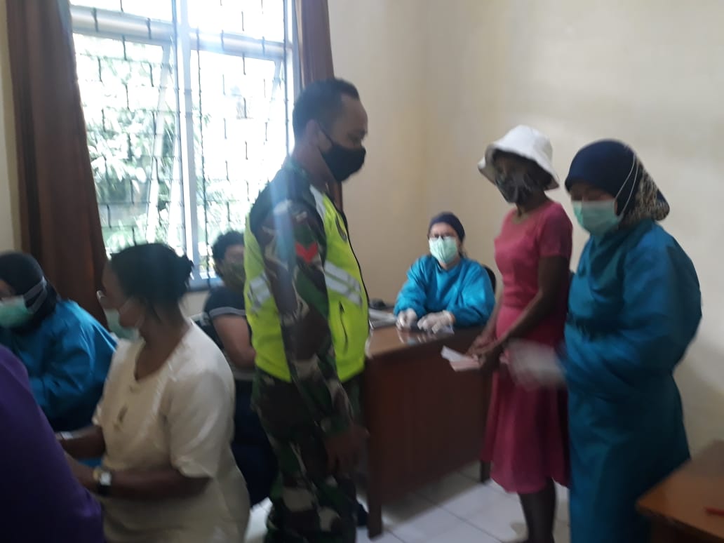 Babinsa memastikan agar dalam pemberian vaksin diterapkan protokol kesehatan memakai masker, mencuci tangan, dan menjaga jarak. (Erris)