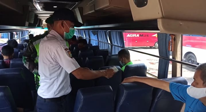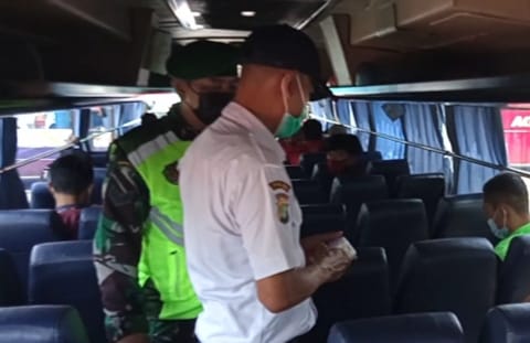 Pengawasan yang dilakukan kepada para penumpang sebelum menaiki Bus antar kota dengan tujuan untuk melihat langsung penumpang dan supir dalam mematuhi protokol kesehatan dengan memakai masker serta menjaga jarak satu dengan yang lainnya.