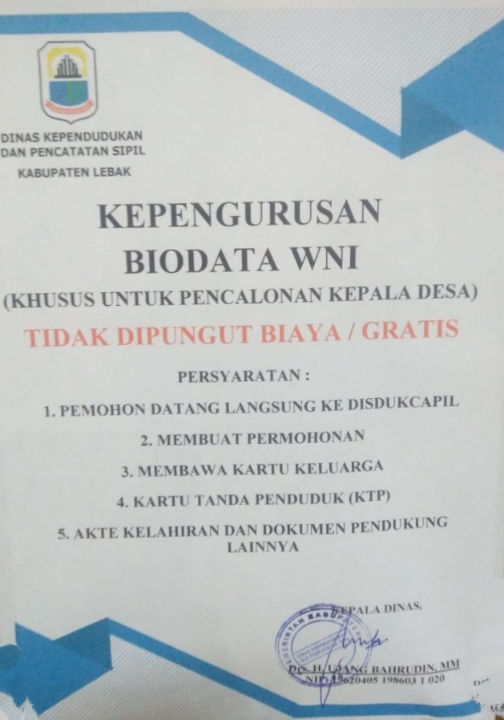 Seperti halnya, syarat wajib bagi seluruh bakal calon kepala desa agar memiliki biodata WNI yang di keluarkan secara resmi oleh dinas kependudukan catatan dan sipil (Disdukcapil) kabupaten Lebak Banten
