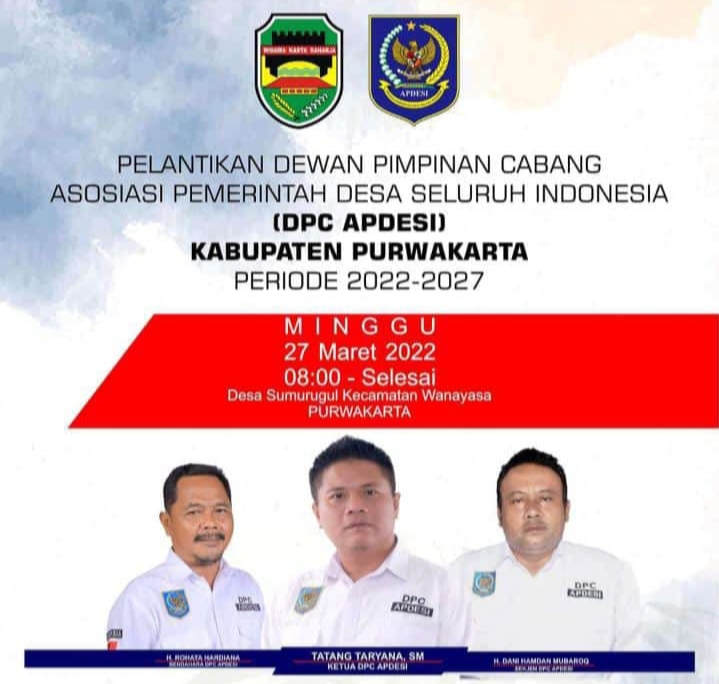 Setelah kepengurusan wadah organisasi para kepala desa itu selesai disusun, hari ini, Minggu 27 Maret 2022 bertempat di Kampung Pasir Karet, Desa Sumurugul, Kecamatan Wanayasa. Organisasi yang dipimpin oleh Kepala Desa Dangdeur, Kecamatan Bungursari itu menggelar prosesi pelantikan pengurus untuk masa bakti 2022-2027.